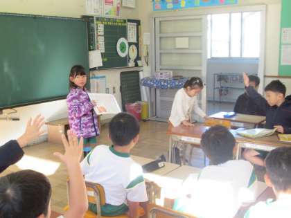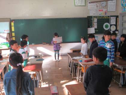 朝会が終わって教室へ。まだ担任の先生が戻ってくる前に、子どもたちだけで朝の会を始めました。スキルの暗唱も自分たちでできていて、感心させられます。