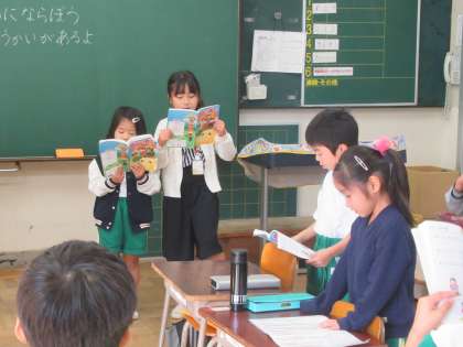 朝の歌を歌いました。歌集を見ながら、声をそろえて歌っています。