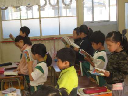 朝の歌を歌いました。歌集を見ながら、声をそろえて歌っています。