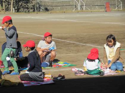 中には、校庭でピクニック気分を楽しんでいる班もあります。