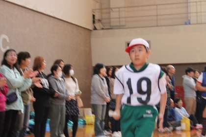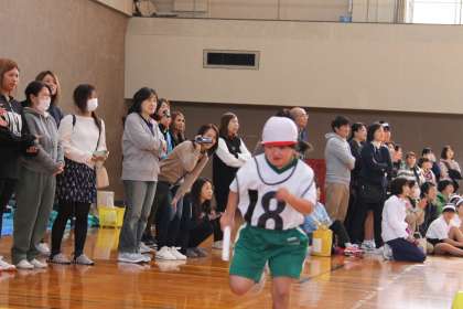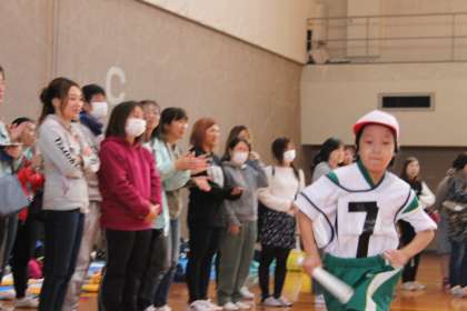 赤白対抗リレー、高学年です。みんなの力で、赤組に追いつけるように頑張っています。