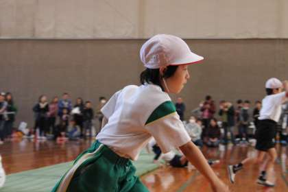 とんでまわってレッツゴーです。ゴム紐をくぐったり、前転をしたりしながらゴールを目指します。色々な動きがあって、大変です。
