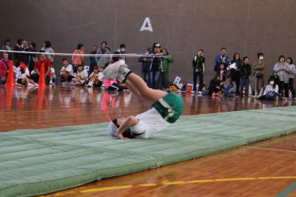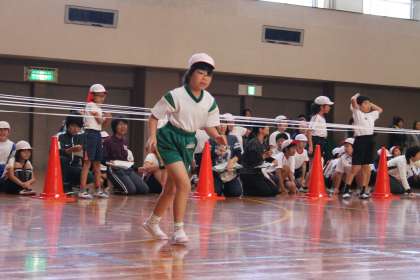 とんでまわってレッツゴーです。ゴム紐をくぐったり、前転をしたりしながらゴールを目指します。色々な動きがあって、大変です。