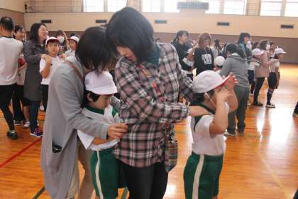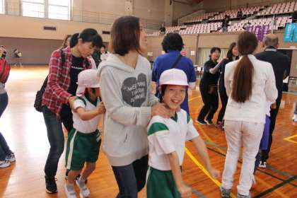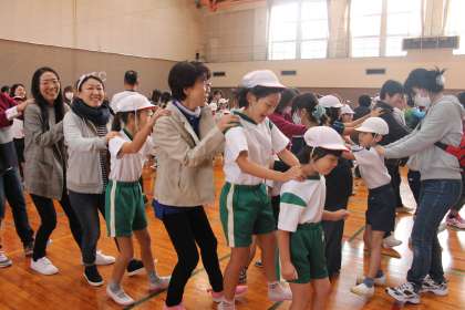 最後はみんなでジェンカです。お家の方も参加しながら、列を作っています。ジャンケンに勝った子はどんどん列が長くなっています。