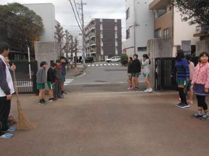 今朝は南門で6年3組と7組、西門で6年2組があいさつボランティアとして参加しています。今週は2組が委員会当番なので、朝の委員会活動と重なってしまい、西門は少ない人数でがんばっていました。