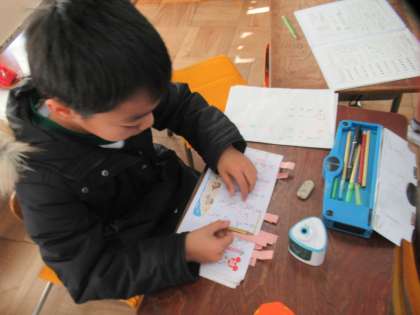 漢字ドリルの直しをしています。学期末なので、先生は付箋を貼って見落としがないように指導してくれています。