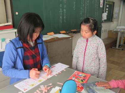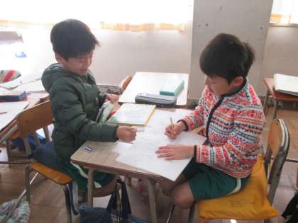 そして、休み時間…。お友だちと絵を描いて遊んでいます。やっぱり楽しそうですね。