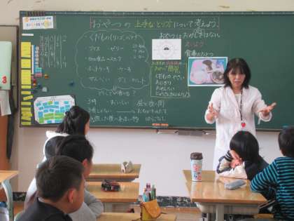 愛鷹小から栄養教諭さんに来ていただいて、食育の授業を行っています。今日の課題は、おやつの上手な取り方です。