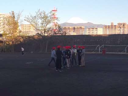雪化粧した富士山が、凛とした姿を見せる朝です。子どもたちは、もう校庭で運動を初めています。