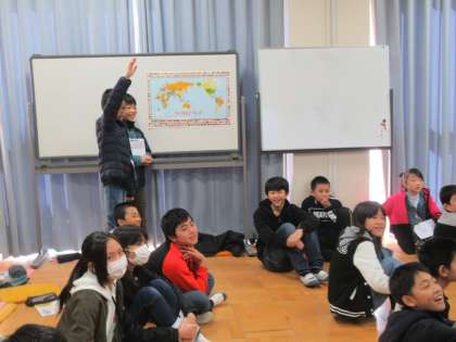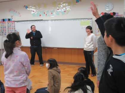 ウォーミングアップのゲームです。ALTの先生の英語での質問に英語で答えられたら、自分より前・後ろ・右・左の列で友だちを座らせてあげることができます。どきどきわくわく楽しみながら、真剣に聴いて懸命に答えます。