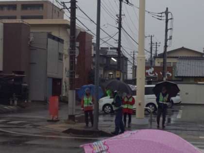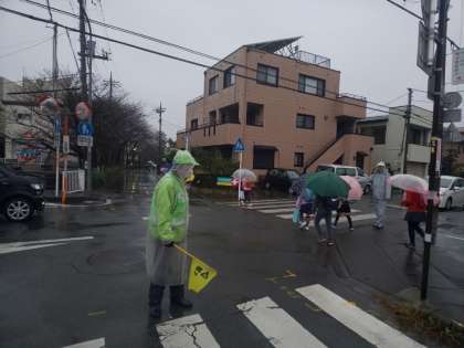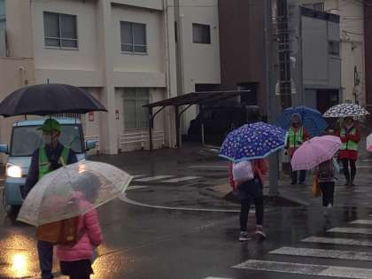 雨の朝も、たくさんのボランティアの方々が、通学路で見守っていてくださいます。ありがたいことです。
