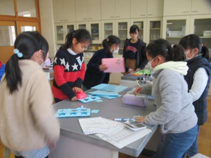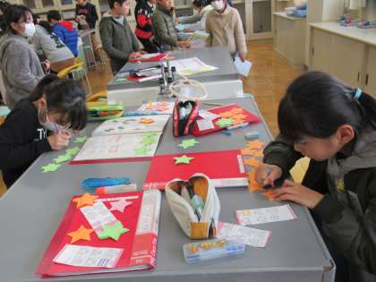 今日も、6年生に贈るカードに下級生が貼る、メッセージカードを作りました。色画用紙を星型に切り抜いて、裏に6年生の名前を書いてグループごとにまとめる、という大変な作業を、手分けして行っていました。
