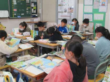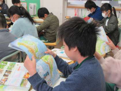 地図帳で、世界に目を向けています。「森林資源の豊かな国はどこだろう?」そんなテーマをもって、調べています。