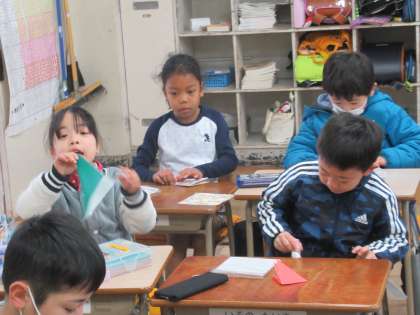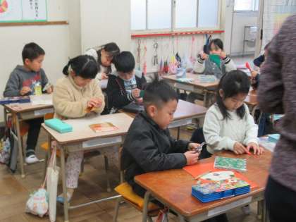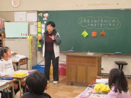6年生を送る会で披露する、たれまくを作ります。文字は先生方が準備してくれたので、まわりの飾りをみんなで作ります。
