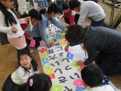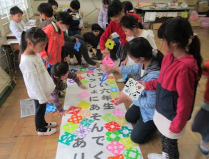 6年生を送る会で披露する、たれまくを作ります。文字は先生方が準備してくれたので、まわりの飾りをみんなで作ります。