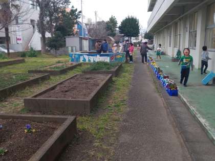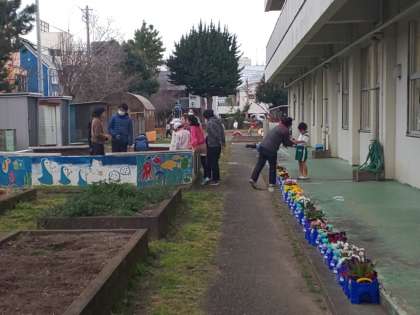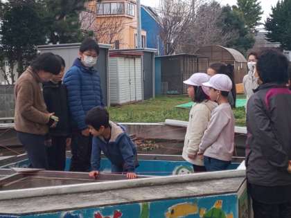 今朝は、7組が餌やり体験をしました。委員会の5年生が、優しく説明をしてくれました。