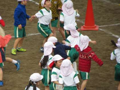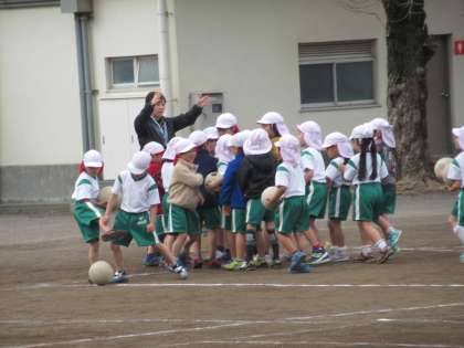 3クラスとも、体育の授業をしています。おにごっこで体を温めたら、ボールけりゲームを始めます。