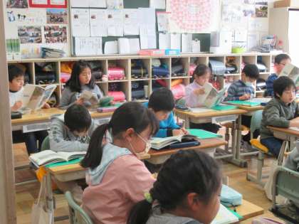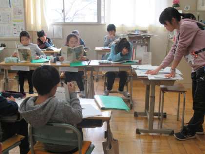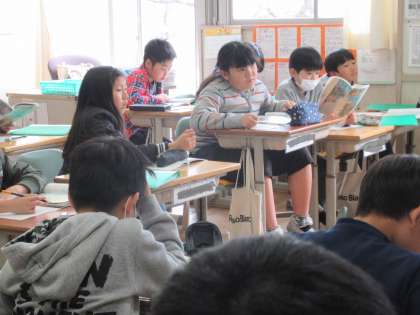 教科書を、みんなで順番に読んでいました。集中して聴いていますね。