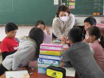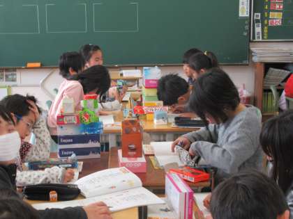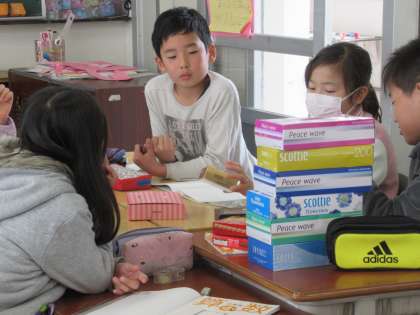持ち寄った箱で、立体の学習をします。まずは、班の中で、意見を交わしていきます。