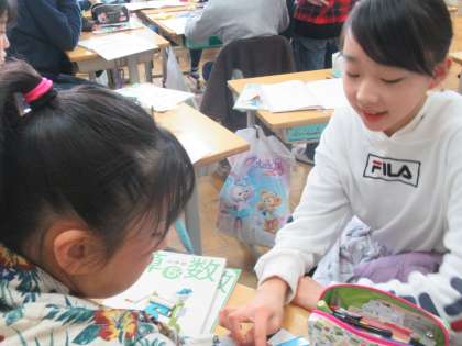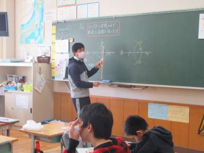 垂直に交わる直線を描いていました。コンパスを使って、正しく効率よく描けているかしら?