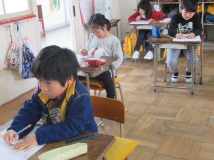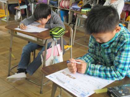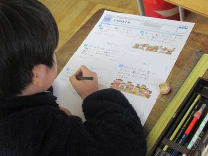 算数のまとめのテストをしています。問題文を読んで、条件を整理し、足し算・引き算のどちらを使うか、答え方は数値だけなのか、判断して解いていきます。