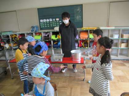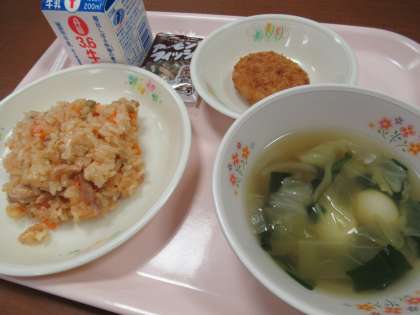 チキンライス 大豆コロッケ うずらたまごと野菜スープ アーモンド小魚 牛乳