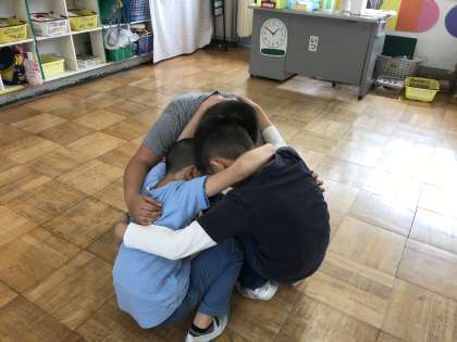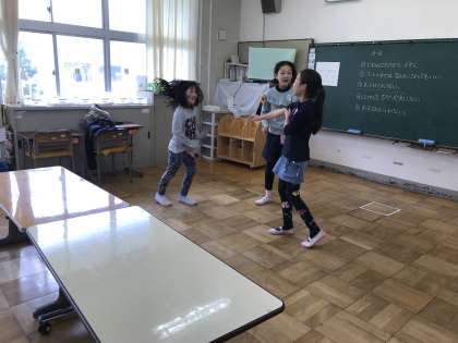教室で風船バレーの大会をしています。男の子チームも女の子チームも、作戦を立てて結束を固めています。