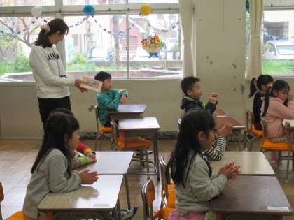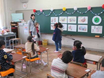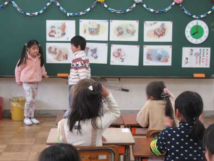 前に出て、役割を決めてあいさつをしてみました。先生とのあいさつ、仲良しの友だちとのあいさつ、場面や相手を考えて、あいさつをしました。がんばった友だちには、拍手を送ります。
