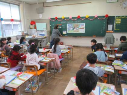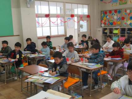 挿絵のうさぎとにんじんにおはじきを置いて、どちらがどれだけ多いのか、調べていました。