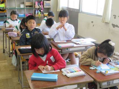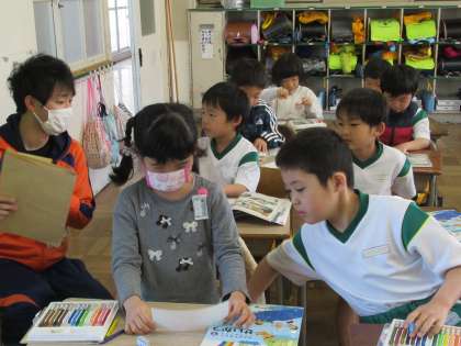 1,2年生でペアを作って学校探検や遠足を行います。今日は、ペアの1年生に渡すカードを作りました。