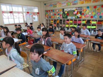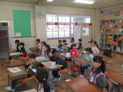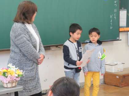 当番さんが、朝の会の司会をしています。当番さんはスピーチもします。聴き手の子どもたちも、友だちのスピーチを聴く練習をしています。