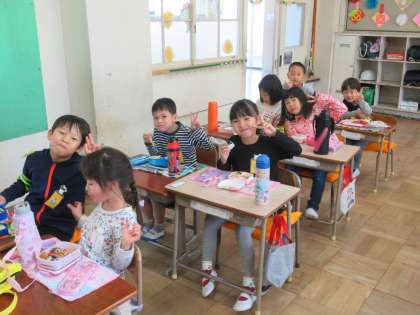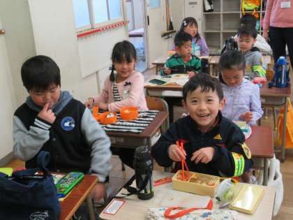 1年生になってできたお友だちと初めてのお弁当です。愛情弁当、おいしいね。