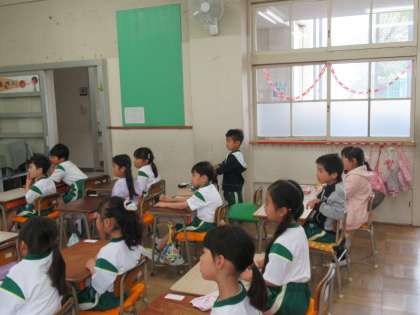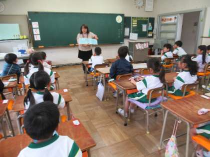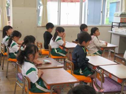 先生が読み聞かせをしてくれました。集中してよく聴いています。