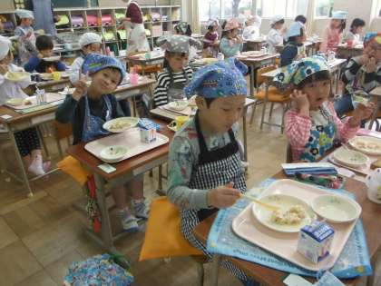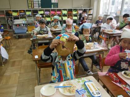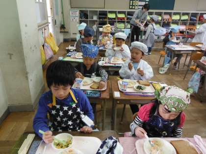 「海藻サラダがおいしい」「グラタン大好き」「パンがあまい味がする」と口々に言いながら楽しそうに食べていました。中にはおかわりをする子もいて頼もしいです。