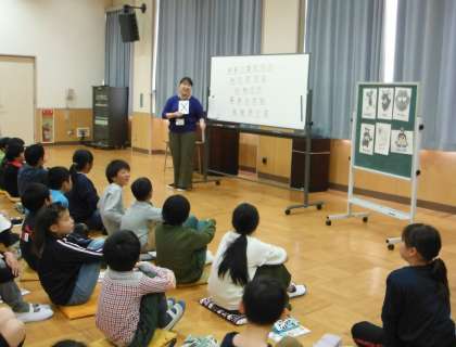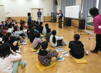 多目的ホールで2組、3組合同でシェル先生と英語の学習をしました。