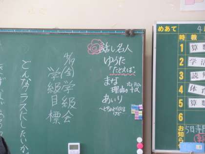 四小では、「あたたかい聴き方」「やさしい話し方」を指導しています。黒板の角には、今日の「話し方名人」が、技とともに称揚されていました。