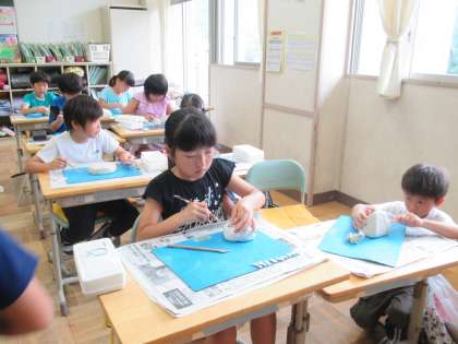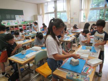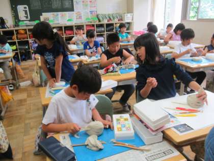 いろいろな道具を使って、粘土作品を作っています。作りながら、イメージを広げます。