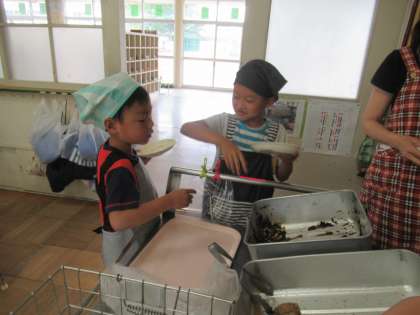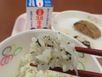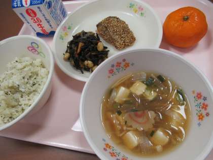 今日の献立は、沼津茶飯・鰆の香味焼き・ひじきと大豆の炒め煮・春雨のすまし汁・牛乳です。「ふるさと給食の日」なので、ご飯には沼津茶とたっぷりのしらす干しが使われています。ひじきもおいしく煮えていて、1年生もおかわりをしていました。