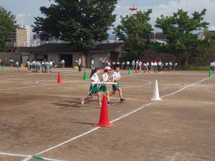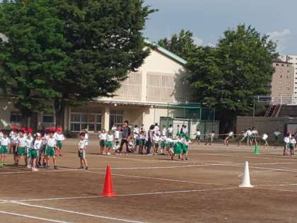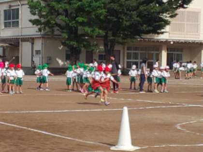 朝の校庭に、子どもたちが続々と出てきます。明日の運動会に向けて、気合い十分です。