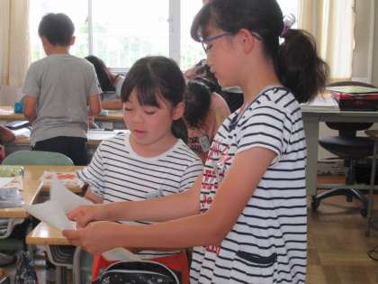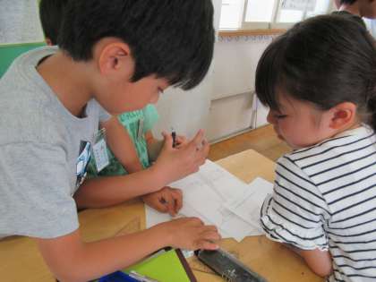 自分の考えが組み立てられたら、友だちと交流します。それぞれがしっかり説明できています。