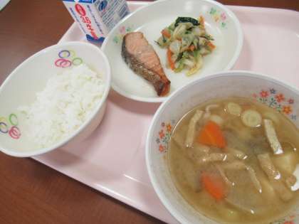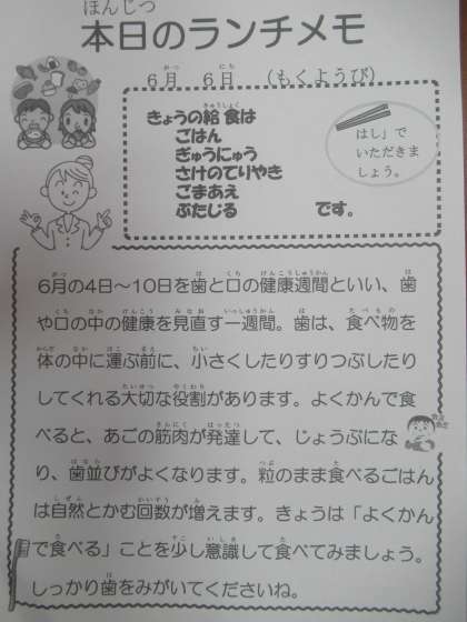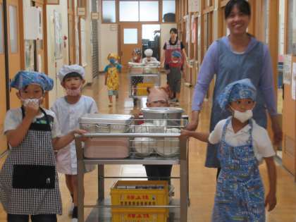 1年生の給食当番さんたちは、安全に気をつけてワゴンを運搬しています。
