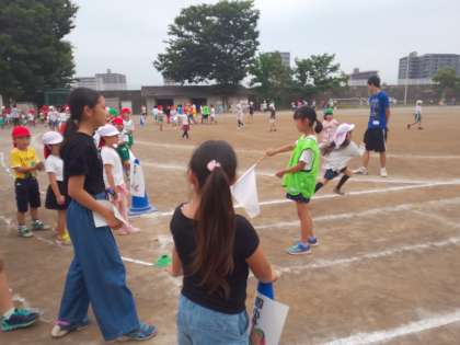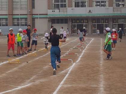 カラービブスを着た体育委員が、スタートの合図をしたり、コースを指示したり、トレーニングを運営しています。