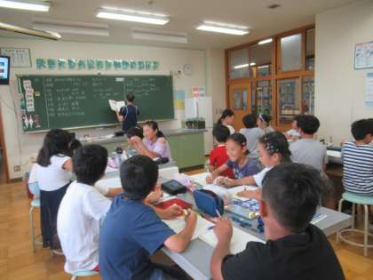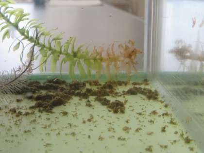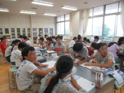 メダカの誕生の学習をまとめています。水槽の真ん中辺りに、生まれたばかりの小さいメダカがいるのが分かるでしょうか。