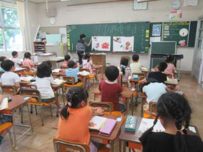「たぬきのじてんしゃ」というお話を読んでいます。物語の展開を楽しんで読んでいます。