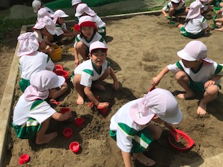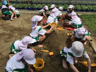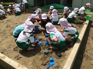 砂や土と仲良くなるために、それぞれのグループで二段ケーキ、大きなお山、お団子に落とし穴など協力して合作しています。