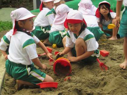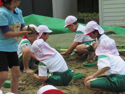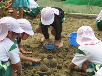 「つちやすなとなかよし」の学習活動です。砂の感触を確かめながら、友だちといっしょに活動を楽しんでいます。