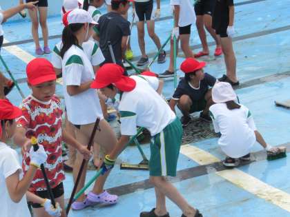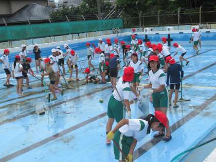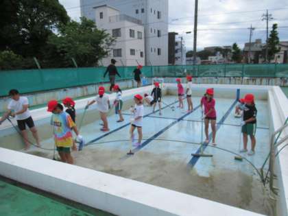 今日は、先週雨で延期になっていたプール清掃を行いました。