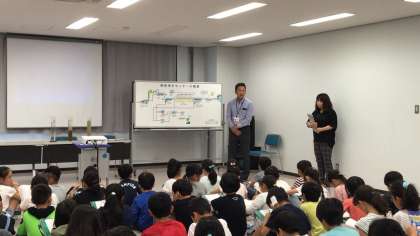 施設の方から、浄化センターについての説明を聞いています。それぞれ大切だと思ったことについて、メモを取っています