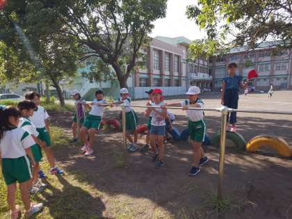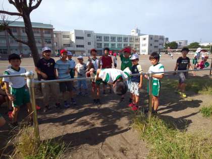 体育の授業で鉄棒を学習していることもあってか、たくさんの子どもたちが、鉄棒運動をしています。