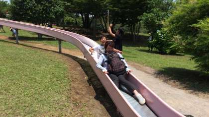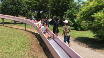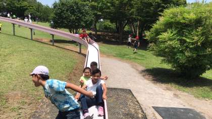 みんなで仲良く滑っていますが、とてもよく滑る滑り台なので、どんどん前の人とくっついてしまいます。「お尻が熱い!」と叫んでいます。